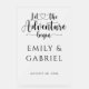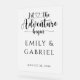 "Laisser l'aventure commencer", panneau de mariage acrylique translucide personnalisé, avec un coeur joignant les lettres. Calligraphie élégante.
