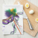 16” x 24” kitchen towel with an image, on both ends, of a beautiful purple, green and gold satin mask on a stick with coordinating feathers and ribbons, green and purple Mardi Gras beads, and the phrase “Laissez Les Bon Temps Rouler!” (French for "Let the Good Times Roll!") in purple French script. See matching cloth napkin, paper cocktail napkin, cloth placemat, paper placemat and coasters. See the entire Mardi Gras Kitchen Towel collection in the FOOD/BEV | Linens section.