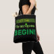 Cette conception de sac fourre-tout est de type maquillé. "LET THE" est dans une bannière verte, le "I" en Shenanigans est émaillé d'un shamrock et "BEGIN !" est en vert, en gras.