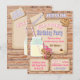 Rustique et joli, Milk and Cookies Anniversaire Invitations avec grand pot de maçon de lait et de paille, pile de biscuits avec ruban, biscuit à puce au chocolat avec une bouchée sortie de celui-ci avec du papier vintage, typographie amusante sur un arrière - plan rustique en planche de bois. Illustration tirée à la main par McBooboo.