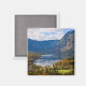 Souvenir photo magnet with a ferry boat on Lake Bohinj approaching the town Ribcev Laz with the prominent church in an autumn landscape with forests with trees in fall colours in Triglav National Park near Bled in Slovenia.