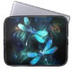 Two transparent, luminous, turquoise, artistically drawn dragonflies on night background with luminescent lake algae and fireflies. Glowing dragonfly.