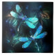 Two transparent, luminous, turquoise, artistically drawn dragonflies on night background with luminescent lake algae and fireflies. Glowing dragonfly.