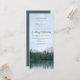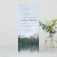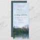 This rustic natural landscape slender wedding invitation card features an oil pastels sketch of a lightly rippled but calm lake, with distant evergreens, cedar trees and rock structures reflected upon its surface, and distant mountains under a blue sky with wispy clouds from the point of view of a paddler kayaking on the lake or a hiker on the opposite shore - mixed fonts text is a coordinating dark teal blue, as is the invitation back - by katz_d_zynes