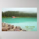 A tranquil scene unfolds with a picturesque Lake Louise, Canada, nestled amidst a dense forest. The water, a vibrant turquoise hue, reflects the surrounding trees and the misty sky above. A small wooden cabin sits on the far shore, adding a touch of human presence to the otherwise untouched wilderness. The foreground features a collection of smooth, rounded rocks, hinting at the lake's edge.