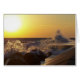 Waves crashing on pier at sunset.