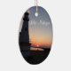 Lake Michigan Sunset Lighthouse Ornament shows a photo of the sunset over the lighthouse in New Buffalo, Michigan