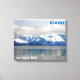 Looking east from Sandpoint, ID across Lake Pend Oreille (pond uh-ray) on a winter day; snow-covered mountains in the distance. Ice has formed at the shore and extends part way across the lake. Blues and greys are the predominate colours. Customizable text reading "IDAHO" also appears. There is also a place to add additional text.