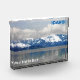 Looking east from Sandpoint, ID across Lake Pend Oreille (pond uh-ray) on a winter day; snow-covered mountains in the distance. Ice has formed at the shore and extends part way across the lake. Blues and greys are the predominate colours. Customizable text reading "IDAHO" also appears. And there is a place for you to add additional text.