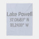 Latitude and longitude GPS map coordinates for the popular outdoor recreation area of Lake Powell bordering Utah and Arizona. Modern, urban grey font on light blue grey background.