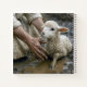 A little lamb rests in the mud while being gently rescued by a shepherd's hands.