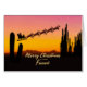 Une carte de Noël pour votre ami montrant Père Noël survolant le désert. Beaucoup de gros cactus sont vus en silhouette. Souhaitez un joyeux Noël du désert avec une belle carte couleur coucher de soleil.