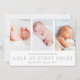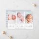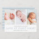 Les cartes de faire-part de naissance simples et modernes comportent trois de vos photos préférées de nouveau-nés alignées côte à côte, avec un bandeau blanc sur le bas de l'écran "l'amour au premier regard" en bleu pastel, flanqué du nom et des statistiques de naissance de votre petit. Les annonces de naissance chic pour bébé garçon à rebours vers un motif rayé subtil dans les tons bleus correspondants.