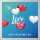 Heureuse Sainte-Valentin "L'amour est dans l'air" ballons rouges et blancs belle illustration moderne. Texte écrit en lettres de script typographique moderne encadré de ballons 3D réalistes en forme de coeur sur un arrière - plan bleu ciel.