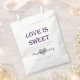 Un sac de faveur personnalisé avec la mention "L'amour est doux. Merci de partager notre journée spéciale." Personnalisé avec les noms de la mariée et du marié écrit sur un coeur, et la date mariage. Parfait pour les faveurs, les buffets de bonbons et plus encore ! Trouvez plus de modèles de sacs de faveur, y compris ce design dans d'autres couleurs! Cliquez simplement sur le lien vers ma boutique ci-dessous où il est dit Art Designed by Sara Winters Designs, puis cliquez sur "Favor Bags" sous Parcourir cette Boutique.