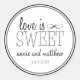 Love Is Sweet Étiquettes / Stickers (Black / Dark Grey / Silver / White)...Cet amour amusant et chic est doux étiquettes / stickers sont idéaux pour les faveurs de mariage ou un bar à sucré mariage / buffet plein de chocolat, suckers, lollipops, taffy, et sucre. Faites savoir à vos invités de ramener un régal avec eux pour se souvenir de votre mariage. Le design comprend un ensemble de polices fantaisistes avec les noms des mariés et des mariés ainsi que la date du mariage. Idéal pour un mariage sur le thème des bonbons. Idéal pour un mariage de destination. Parfait pour toute mariée ou mariée avec une dent sucrée. Idéal pour une douche nuptiale ou une soirée bachelorette. Personnalisable...il suffit de changer les noms et les dates et vos autocollants de faveur sont prêts à être utilisés. Disponible dans une large gamme de couleurs pour correspondre à vos couleurs mariages. Voir WindyCityStationery.com pour notre gamme complète de étiquettes "L'amour est doux" dans une large gamme de couleurs ainsi que les timbres-poste "L'amour est doux" assortis, cartes de remerciements, étiquettes d'adresse de retour, enregistrer les dates et plus encore.