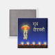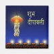 Happy Diwali Illustration : Une lampe Diwali brillante avec des diyas rouges (lampes à huile indienne en forme de tasse) avec une bordure ornementale sur un arrière - plan du ciel nocturne et l'accueil écrit en sanskrit.