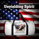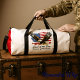 This white duffle bag features a powerful patriotic design with a majestic bald eagle in flight against a distressed American flag backdrop. The text "Land of the Free Because of the Brave" is prominently displayed below. This design is perfect for showing pride and gratitude for American freedom and military service. Edit colour of the bag caps and body in the Design tool to your favored colours.