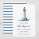 Elegant coastal engagement party invitations feature a watercolor illustration of a lighthouse in navy, red, and white on a teal sea, topping your engagement party details in chic nautical navy blue lettering.