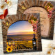 Wedding invitation featuring a classic Roman arch with grapes, a lantern and sunflower with on the back a painting of a vineyard with wine and glasses. Beautiful for a vineyard or winery wedding or other wine themed celebration. This invitation has a matching RSVP card.