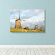 Canvas landscape print of three windmills and sheep looking into the camera under beautiful clouds in the sky in a lovely spring landscape in the countryside in the Netherlands.
