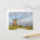 Photo postcard of three windmills and sheep looking into the camera under beautiful clouds in the sky in a lovely spring landscape in the countryside in the Netherlands with a white edge and the text 'Netherlands'.