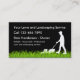 A lawnmower serviceman appears on this business card cutting the grass and the text templates you can customize are easy to change to your own business information online. Designed for a lawn or landscaping service.