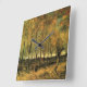 Lane with Poplars by Vincent van Gogh is a vintage fine art post impressionism landscape nature painting. Poplar trees line the street and people are walking along a road with a village in the distance. A church is in the centre of town. The leaves are golden and about to fall off the trees in the autumn season.