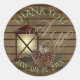 Rustic lantern and pine, winter barn wood wedding favour sticker with bride and groom's initials and wedding date. Antique lantern with a bouquet of baby's breath and pinecones.