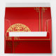 Beautiful hong bao with ideogram meaning Fortune and Good Luck + Chinese lanterns and golden Ox paper-cut. Design on red envelope.