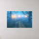 Four glowing lamps on four lampposts shine through dense fog, illuminating a winding path through the shadows and bare banches of winter trees.