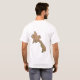An editable title and slogan accompanies the white circle centred over a blue band with red bands above and below of the Lao flag on the front of this t-shirt. The back displays a detailed map of Laos.