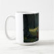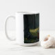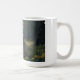 Cette tasse montre un lapin de Pâques brun et blanc foncé dans les bois avec un panier de surprises.