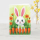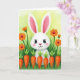 Cette carte présente un lapin blanc stylisé qui regarde par-dessus un épais tapis d'herbe verte émeraude, son visage et le haut de son corps centrés comme s'il se penchait pour un salut amical 🐰. Devant, sept légumes-racines orange soigneusement alignés avec des feuilles vertes créent une rangée de jardin soignée qui ressemble à un moment partagé entre le lapin et le spectateur. Les grands yeux bleus du lapin, son petit nez rose et ses joues rosées lui donnent un air tendre et affectueux, comme s'il était discrètement ravi de voir quelqu'un de spécial. De grandes oreilles s'élèvent au-dessus de sa tête avec des détails intérieurs rose pâle, ajoutant une touche douce et confortable à la scène. L'arrière-plan se fond dans une teinte verte pâle et ensoleillée, gardant l'attention sur le lapin et le jardin tout en suggérant un calme matin de printemps. De petites fleurs orange chaud avec des pétales en forme d'étoile et des centres rouges plus foncés parsèment la verdure, comme des notes joyeuses glissées dans le paysage 🌷. Tout texte de vœux se placerait bien près du haut dans une teinte pastel douce, avec une ligne plus petite