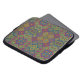 Laptop sleeve featuring a colorful, intricate geometric pattern of diamonds and squares in blue, green, yellow, and pink. The design conveys a vibrant, playful tone.