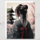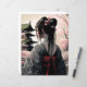 Computer-generated design of a Geisha. A picture of a woman with a nice hairstyle and flowers in her hair wearing a kimono in a simple design with light lines. Japanese design in AI - Midjourney Style. Red ornaments give the picture a certain amount.