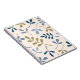 Illustrative surface pattern design of assorted leaf silhouettes in blues and faux gold colour on a cream colour background.