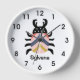 A large colourful striped beetle bug with black pincers and legs crawls straight ahead. Clock has easy to read large black numbers, can be personalized with any name.