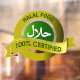 Modern large green and gold halal food 100% certified in english and arabic حلال food sign for businesses.