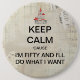 Our Large Keep Calm Fiftieth Birthday Button is a fun and quirky gift idea for friends turning 50. Available in a variety of sizes. Parody design features birthday cake motif joined with distressed grunge background pattern. Take advantage of the available volume discount and purchase a smaller size as fiftieth birthday party favours.