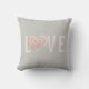 This beautiful throw pillow has large letters that spell LOVE with the "O" filled with a decorative pink heart button that even has a faux stitch! Off-white letters on a light grey background. Perfect and unique home decor accent for the farmhouse to boho style home. Design by Farmhouse Living.