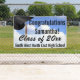 Blue sky background with black mortarboard cap and tassel. Personalized outdoor or indoor graduation party sign banner with your graduate's year, name, high school. Spectacular way to congratulate the graduate and welcome family and guests to your graduation party .