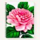 Journal in a large closeup image of a peony blossom, in shades of pastel to medium coral pink, with emerald green leaves