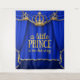 Large prince baby shower backdrop with beautiful gold crowns on an elegant royal blue and gold curtain background. This beautiful royal blue and prince baby shower backdrop is easily customized for your event. You can remove and resize the little prince word graphic as needed.