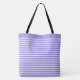 This tote bag is shown with a fun Lavender and white striped print design. Large size shown. Has Black straps.