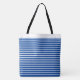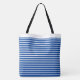 This tote bag is shown with a fun Royal Blue and white striped print design. Large size shown. Has Black straps.