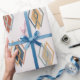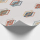 This wrapping paper has a mid-century modern design of sets of two diamond outlines with one solid diamond, in greys, gold, orange, blue, and tan, scattered about the design on a field of off-white. If you like the design but prefer different colours, message me.