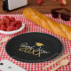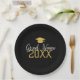 A modern black and gold plate with a gold grad cap and bold text with a theme. A great graduation party decor addition to celebrate the graduate. Personalize with a name and date.