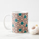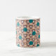 This mug has a geometric design of repeating brown and tan triangles with turquoise circles on top on a field of off-white. Want the same design in different colours? Message me.