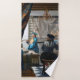 Johannes Vermeer (Octobre 1632 - Décembre 1675), dans l'original néerlandais Jan Vermeer van Delft, était un peintre de l'époque baroque hollandaise qui se spécialisait dans les scènes intérieures intérieures de la vie de classe moyenne. Au cours de sa vie, il a été un peintre de genre provincial modérément réussi, reconnu à Delft et à La Haye. Néanmoins, il a produit relativement peu de tableaux et n'était évidemment pas riche, laissant sa femme et ses enfants endettés à sa mort. Vermeer travaillait lentement et avec grand soin, et utilisait fréquemment des pigments très coûteux. Il est particulièrement réputé pour son traitement magistral et son utilisation de la lumière dans son travail. "Presque tous ses tableaux", écrivait Hans Koningsberger, "sont apparemment installés dans deux petites pièces de sa maison de Delft ; ils montrent les mêmes meubles et décorations dans divers arrangements et ils dépeignent souvent les mêmes personnes, surtout des femmes". Sa modeste célébrité a cédé la place à l'obscurité après sa mort. Il a été à peine mentionné dans le principal livre source d'Arnold Houbraken sur la peinture hollandaise du 17ème siècle (Grand Théâtre des Peintres hollandais et des Artistes femmes) et a donc été omis des enquêtes ultérieures sur l'art hollandais pendant près de deux siècles. Au 19ème siècle, Vermeer fut redécouvert par Gustav Friedrich Waagen et Théophile Thoré-Bürger, qui publièrent un essai qui lui attribuait 66 photos, bien que seulement 34 peintures lui soient aujourd'hui attribuées par tous. Depuis lors, la réputation de Vermeer s'est développée et il est maintenant reconnu comme l'un des plus grands peintres de l'âge d'or hollandais. Citation : Wikipedia